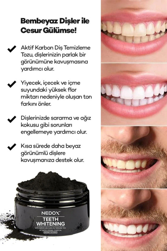 پودر سفید کننده دندان با کربن فعال الماس سیاه Nedox به تمیز کردن لایه زرد دندان و داشتن دندان های سفیدتر کمک می کند. همچنین به از بین بردن لکه های روی دندان و بوی بد دهان کمک می کند. به خصوص به از بین بردن لکه های ناشی از سیگار کشیدن و قهوه کمک می کند. این به تمیز کردن موثر مینای دندان کمک می کند و لبخندی سفید به شما می بخشد. روش استفاده: مخلوط را روی یک مسواک کمی مرطوب بریزید. به مدت 3 دقیقه مسواک بزنید و در پایان زمان به خوبی با آب بشویید. دو بار در روز استفاده کنید تا به نتیجه دلخواه برسید. هشدارها: در بسته، دور از نور مستقیم خورشید و گرما نگهداری شود. از تماس با چشم. در صورت تماس با آب فراوان شستشو دهید. آن را دور از دسترس کودکان و در بسته بندی آن نگهداری کنید. محتویات / ترکیبات: کربن، بی کربنات سدیم، روغن کوکوس نوسیفرا