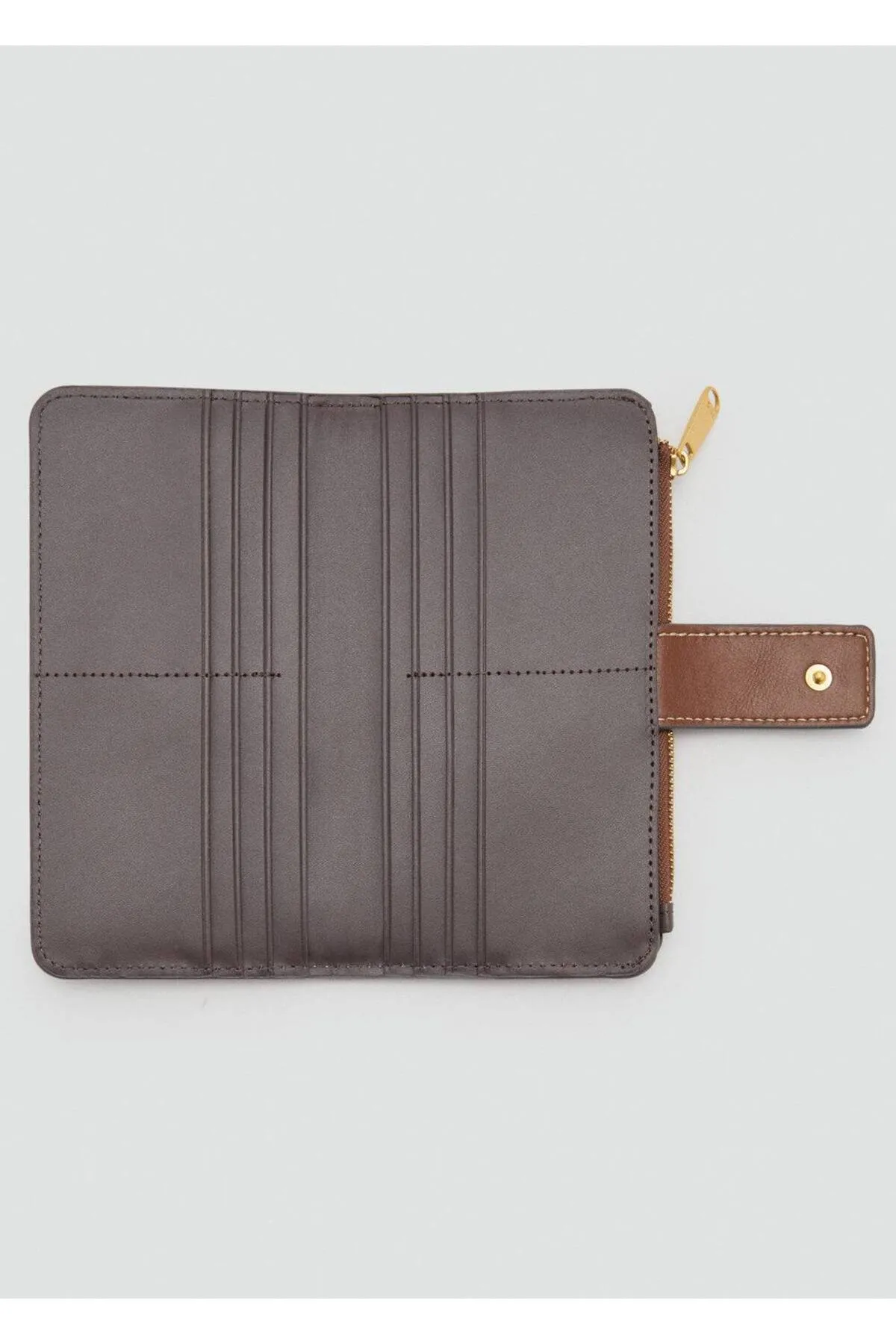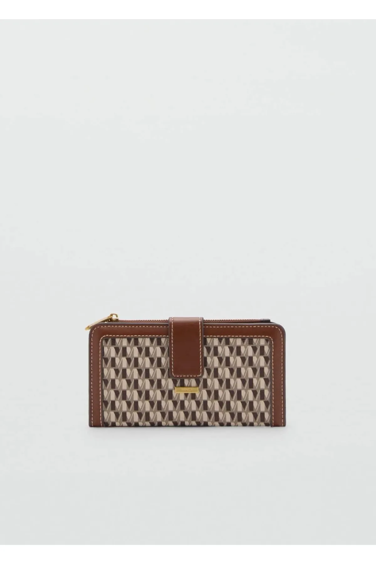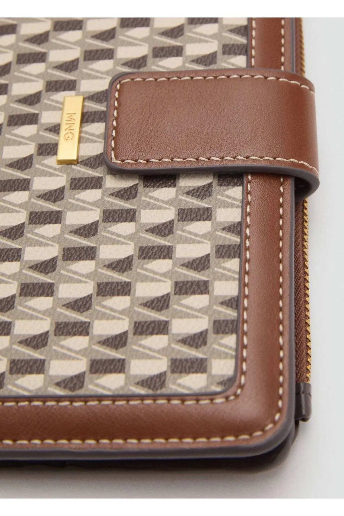 - جلوه چرمی، اندازه متوسط، الگوی Mangologo، جای کارت چندگانه، بسته شدن با زیپ، بسته شدن دکمه Snap، آستر داخلی.