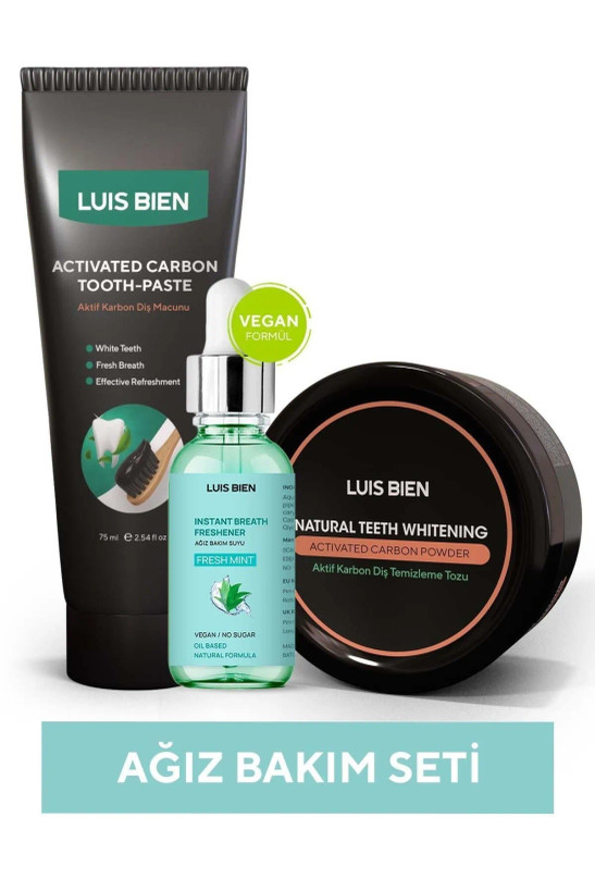 ست مراقبت از دهان (پودر دندان با کربن فعال + خمیر دندان با کربن فعال + محلول مراقبت از دهان نعنا) برند Luis Bien