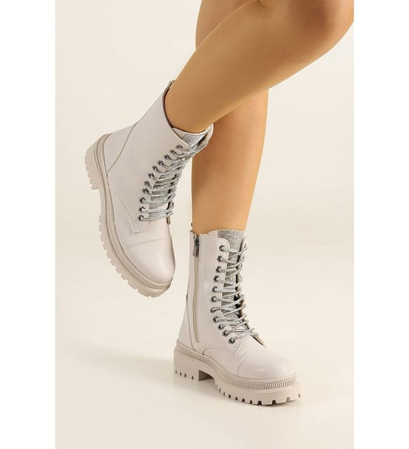 چکمه های زنانه بند دار بژ با جزئیات سنگی